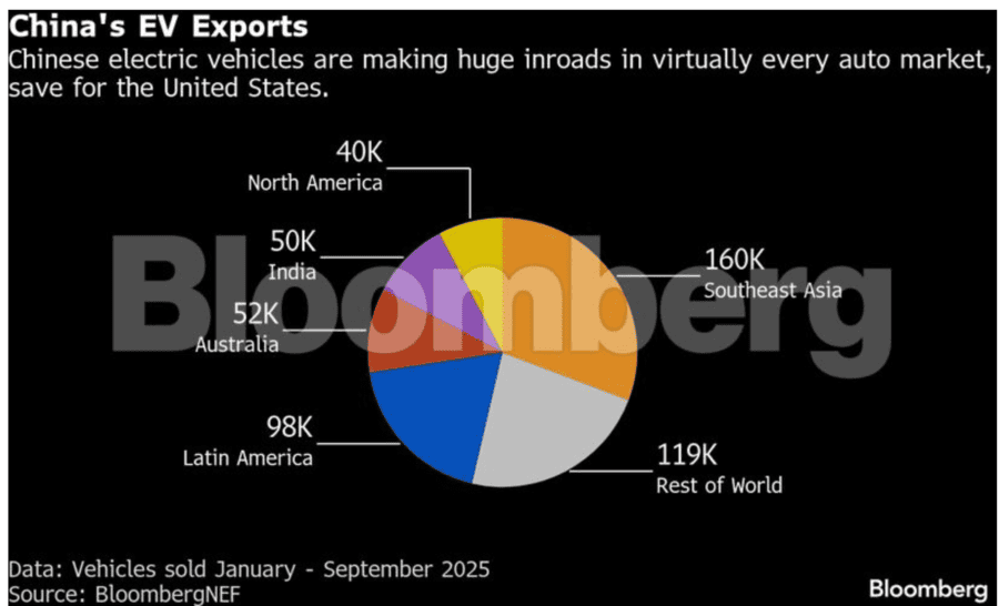Produsen otomotif China semakin agresif menggarap pasar ekspor seiring permintaan domestik melemah. Dalam sembilan bulan pertama 2025, perusahaan China menjual hampir satu juta EV ke luar negeri, melonjak 54% dibandingkan 2024.
