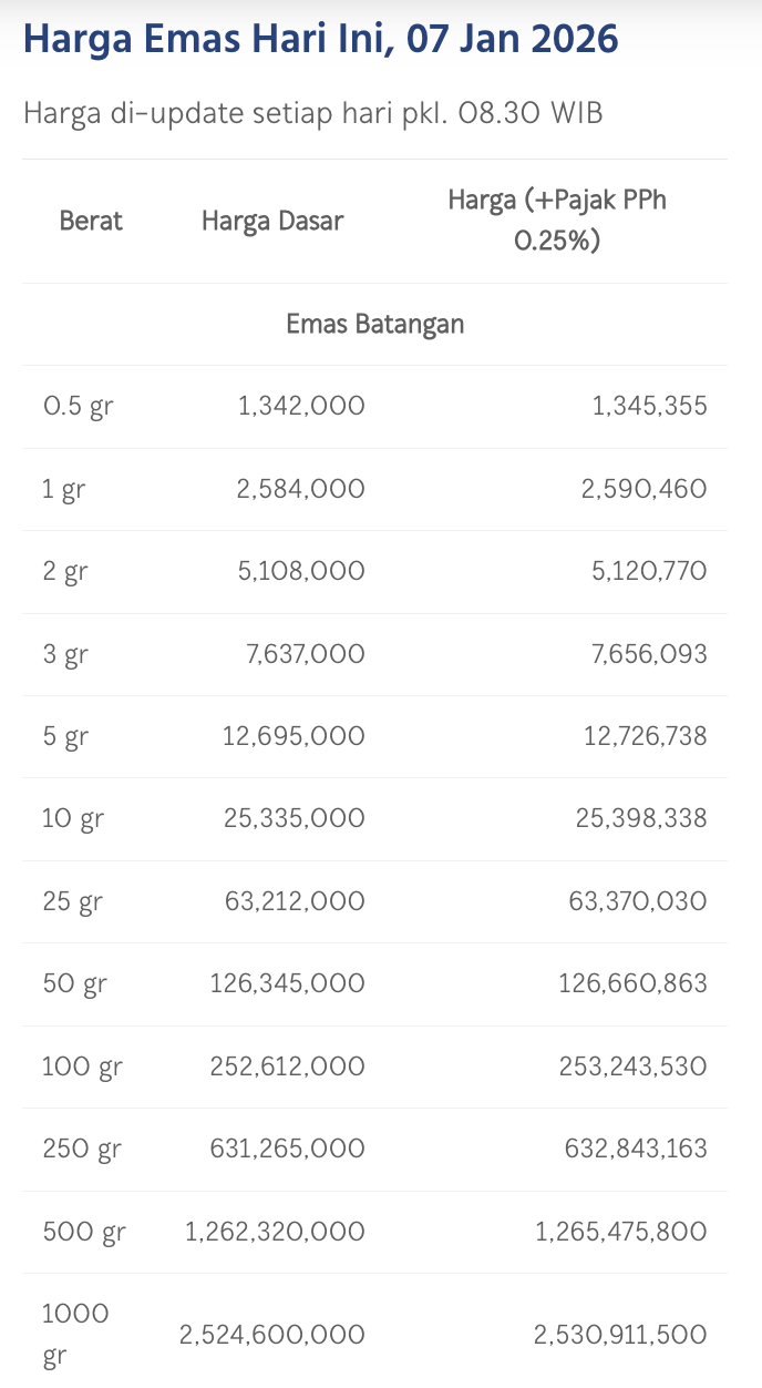 Pada Rabu (7/1/2026), emas Antam dihargai Rp 2.584.000/gram. Naik Rp 35.000 dari posisi perdagangan kemarin.