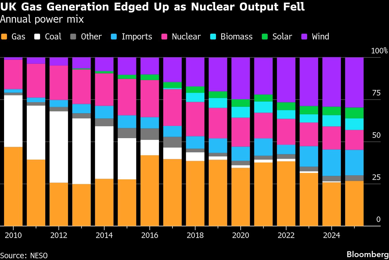 Pembangkitan nuklir turun sekitar 11% ke level terendah dalam lebih dari satu dekade di tengah pemeliharaan dan pengisian ulang bahan bakar, menurut data NESO yang dihimpun Bloomberg.