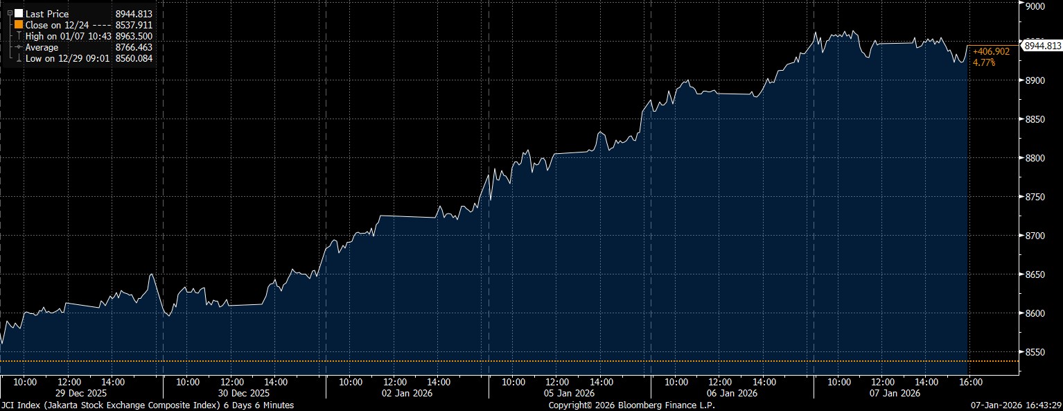 Pada Rabu (7/1/2026), IHSG menutup hari di posisi 8.944,81 yang sekaligus merupakan pencapaian level harga tertinggi All Time High/ ATH baru penutupan. Bursa Saham Tanah Air terapresiasi 0,13% dari hari sebelumnya, borong pecah rekor hingga 6 kali berturut-turut.