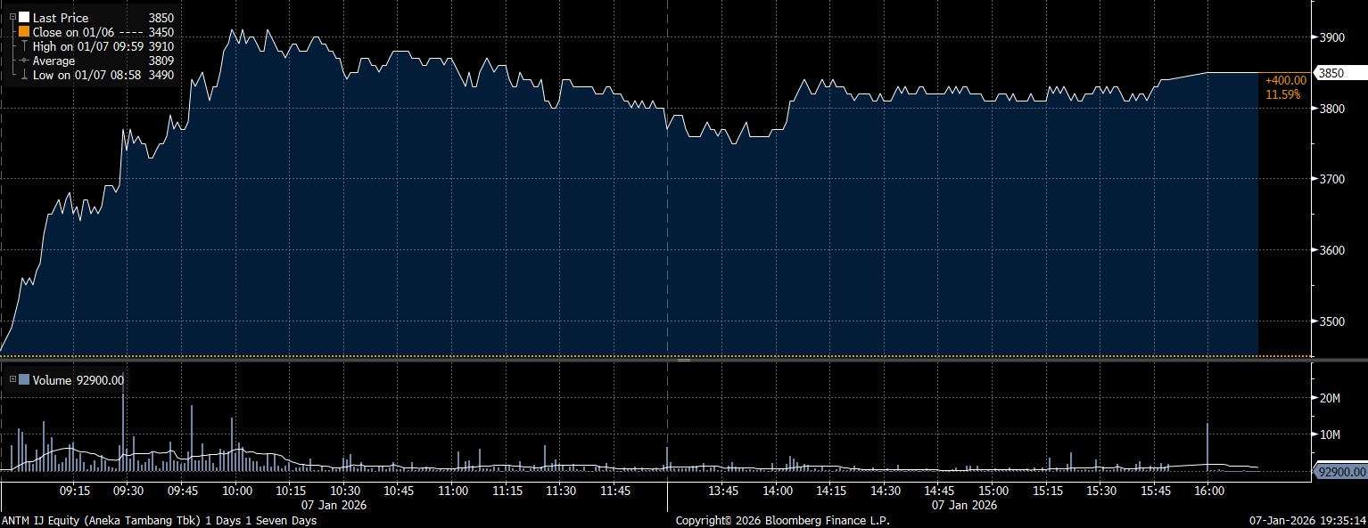 Adapun investor asing mencatat net buy terbesar pada saham PT Aneka Tambang Tbk (ANTM) mencapai Rp614,11 miliar. Dipacu oleh akumulasi beli yang agresif, saham ANTM menguat 11,59% hingga melesat di posisi Rp3.850/saham.
