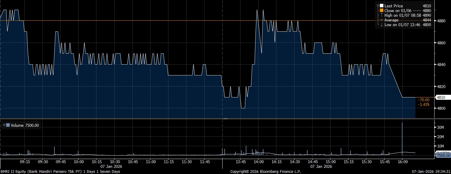 Sedang pada kesempatan yang sama, investor asing net sell yang masif pada saham PT Bank Mandiri Tbk (BMRI) mencapai Rp594,08 miliar. Sebagai imbas manuver jual, saham BMRI melemah 1,43% dan ditutup di posisi Rp4.810/saham.
