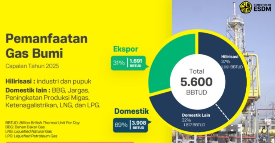 Bloomberg Technoz, Jakarta - Kementerian Energi dan Sumber Daya Mineral (ESDM) membeberkan realisasi pemanfaatan gas bumi untuk pasar domestik mencapai 3.908 billion British thermal unit per day (BBtud) sepanjang 2025.