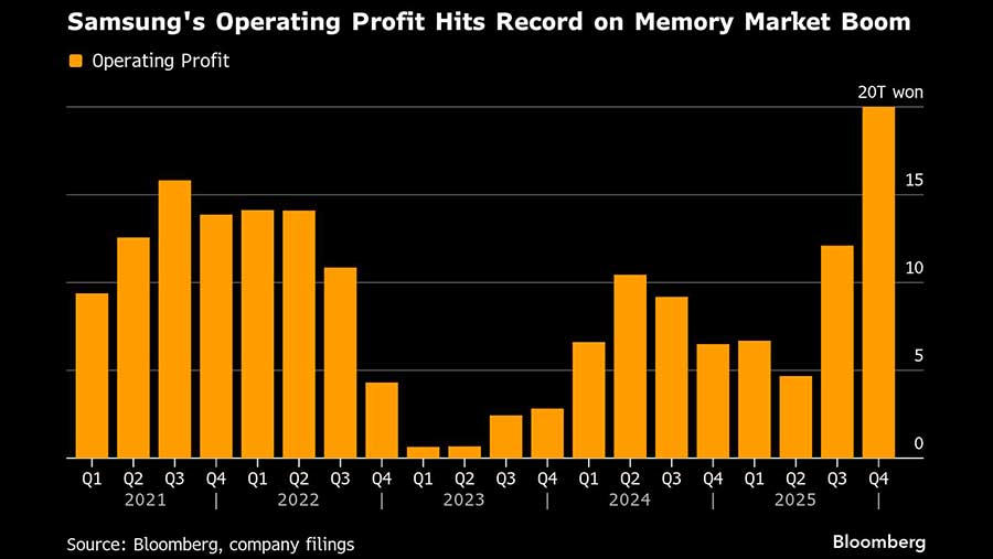 “Margin laba operasional Samsung sebesar 21,5% pada kuartal keempat 2025 menunjukkan bahwa perusahaan akan diuntungkan oleh permintaan yang kuat terhadap DRAM konvensional, memori bandwidth tinggi (HBM), dan chip NAND,” Masahiro Wakasugi dan Takumi Okano, analis dari Bloomberg Intelligence.