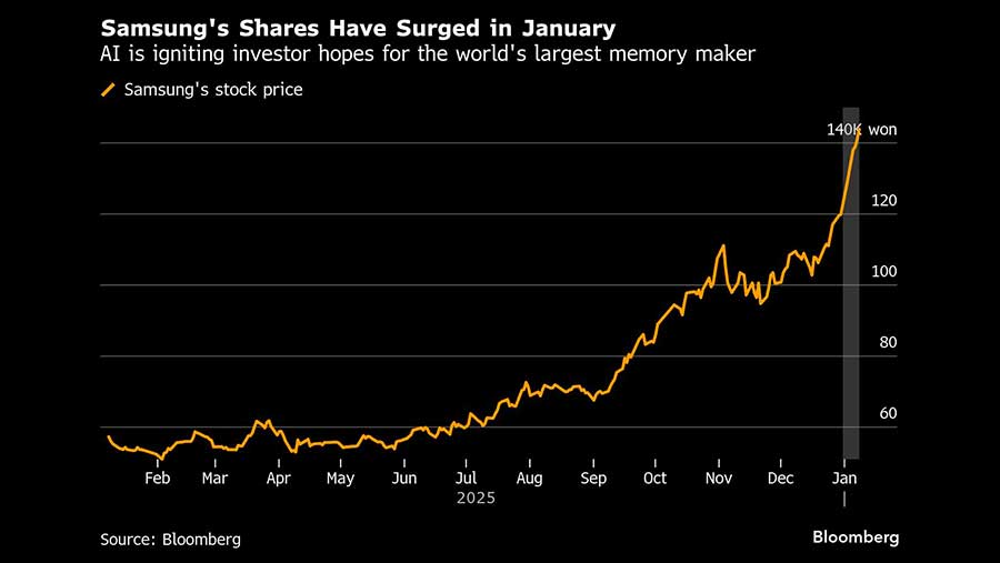 Saham Samsung telah lebih dari dua kali lipat nilainya pada tahun 2025 dan kembali melonjak bulan ini, mencerminkan harapan akan tahun yang gemilang setelah pesaingnya, Micron Technology Inc., memberikan proyeksi yang optimis. Lebih dari 10 analis yang dilacak oleh Bloomberg menaikkan target harga untuk Samsung dalam seminggu terakhir saja.