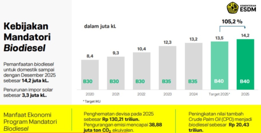 Lebih lanjut, realisasi progam B40 pada 2025 juga diklaim berkontribusi terhadap penghematan devisa senilai Rp130,21 triliun pada tahun lalu, serta pengurangan emisi mencapai 38,88 juta ton CO2 ekuivalen.