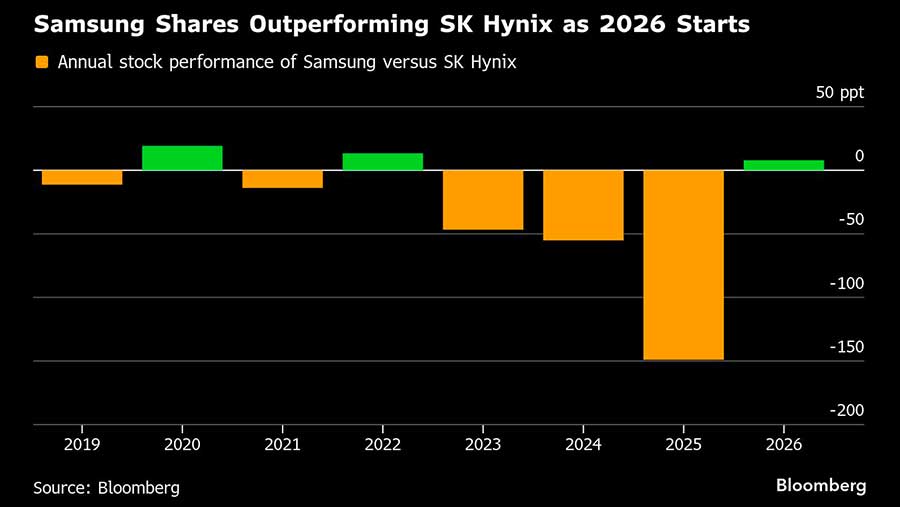 Pergerakan Samsung sejauh ini mengungguli saham SK Hynix Inc. pada 2026, setelah tiga tahun kinerja yang jauh di bawah rata-rata saat pesaing yang lebih kecil itu mendapat dukungan dari pelanggan utama Nvidia Corp. Kini, harapan akan kemajuan dalam artificial intelligence(AI) juga kenaikan harga yang signifikan untuk chip memori mendorong prediksi bahwa “Samsung siap kembali.”
