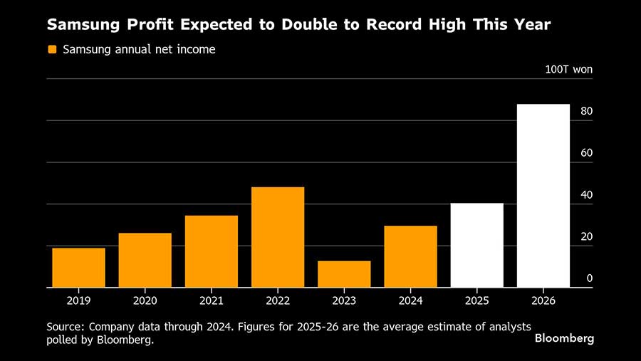 Analis yang disurvei oleh Bloomberg memperkirakan laba Samsung akan lebih dari dua kali lipat pada 2026 menjadi rekor tertinggi sekitar US$60 miliar, sejalan dengan proyeksi untuk Taiwan Semiconductor Manufacturing Co. (TSMC). Namun, kapitalisasi pasar Samsung sebesar US$560 miliar masih kurang dari setengah kapitalisasi pasar TSMC, perusahaan paling berharga di Asia.