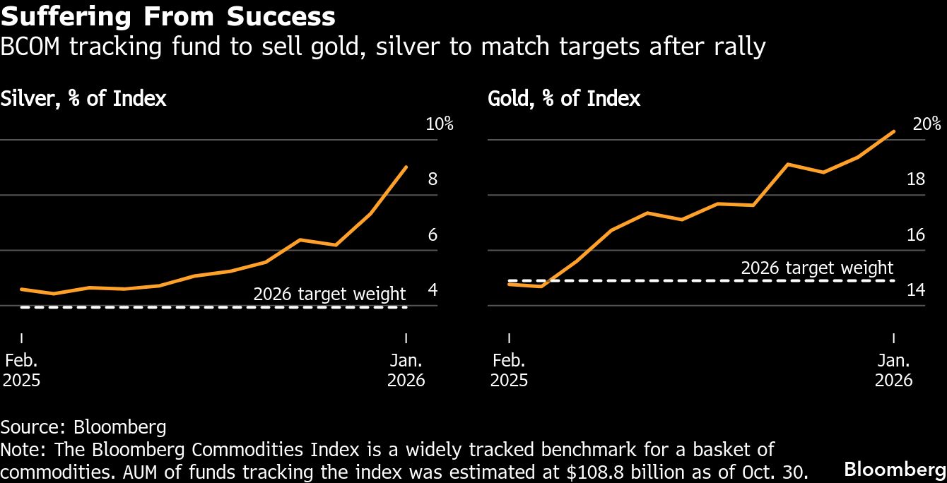 Arus keluar dari kontrak berjangka emas diperkirakan akan mencapai jumlah yang kurang lebih sama, menurut Citi, berdasarkan estimasi dana yang melacak Bloomberg Commodity Index dan S&P Goldman Sachs Commodity Index. Penyeimbangan ini diperlukan menyusul lonjakan tajam bobot logam mulia dalam indeks acuan komoditas.
