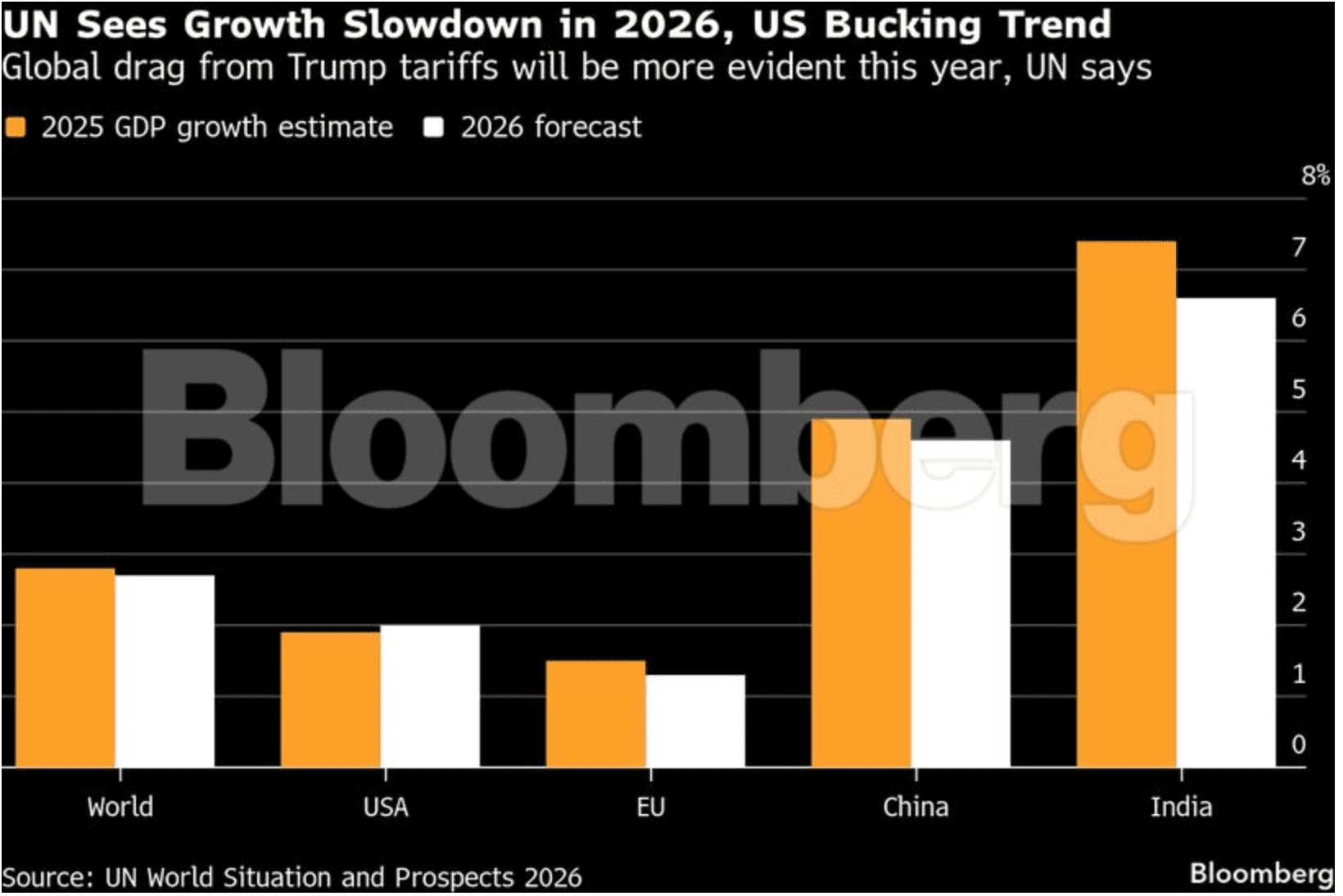 Bloomberg, Persatuan Bangsa-Bangsa (PBB) memperkirakan pertumbuhan ekonomi global diperkirakan sedikit melambat pada 2026 seiring dampak tarif Presiden Donald Trump yang kian terasa dan meluasnya ketidakpastian geopolitik.