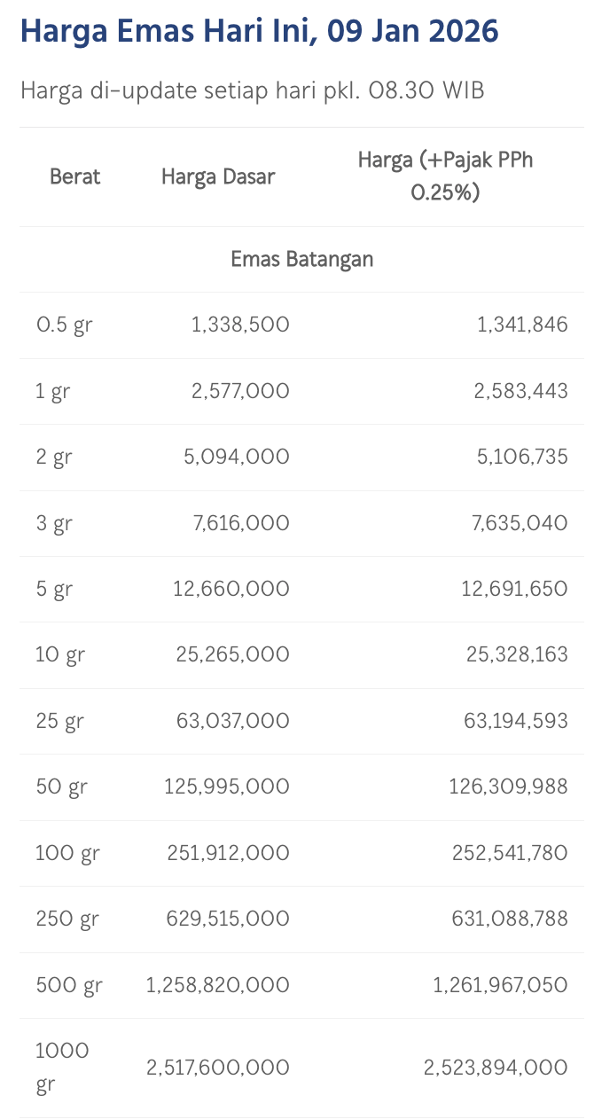 Pada Jumat (9/1/2026), emas Antam dihargai Rp 2.577.000/gram. Menguat Rp 7.000 dari posisi perdagangan kemarin.