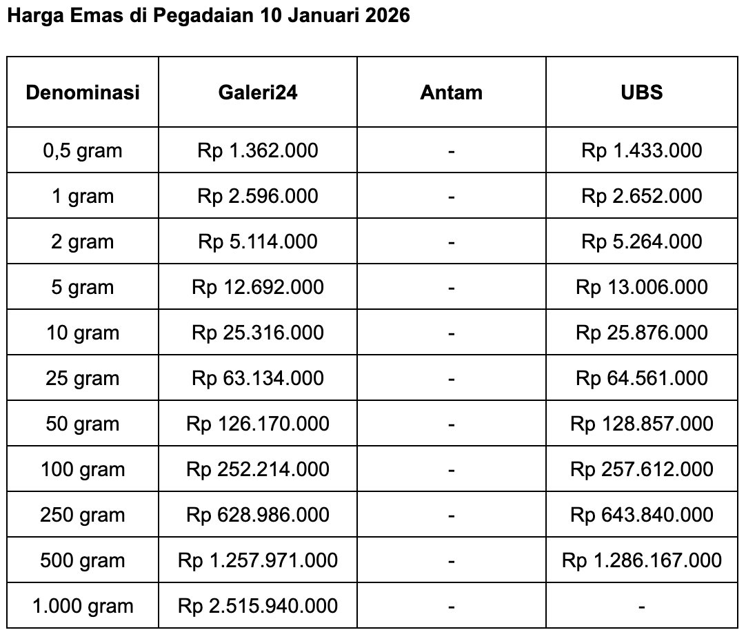 Lalu untuk emas batangan Galeri 24 ukuran 0,5 gram, Pegadaian menjual di harga Rp 1.362.000. Bertambah Rp 4.000 5.000 dalam sehari.