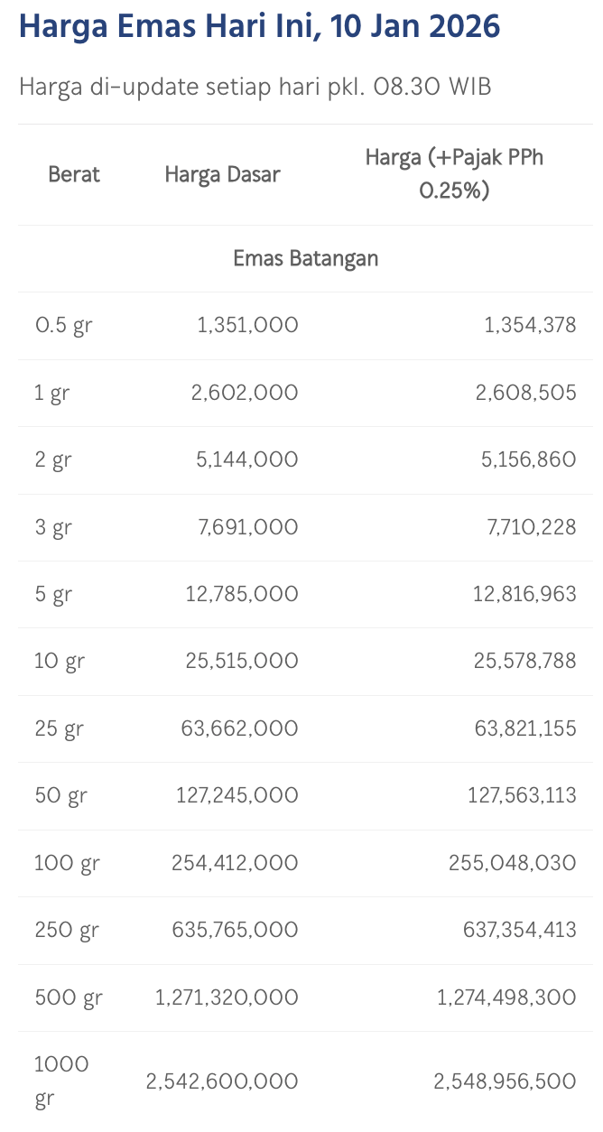Pada Sabtu (10/1/2026), emas Antam dihargai Rp 2.602.000/gram. Menguat Rp 25.000 dari posisi perdagangan kemarin.