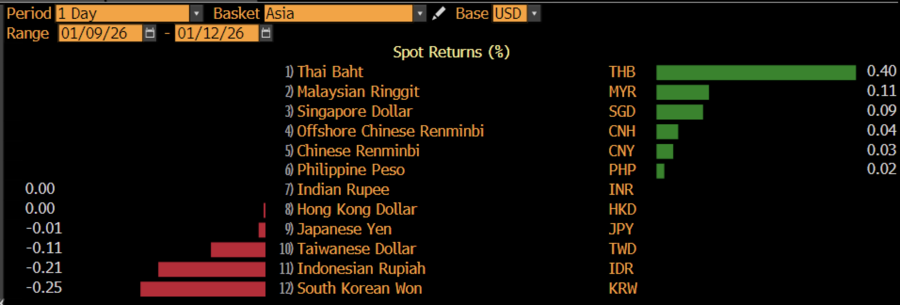 Baht Thailand memimpin penguatan sebesar 0,4%. Ringgit Malaysia menguat 0,11%, dolar Singapura 0,09%, offshore renimbi China 0,04%, peso Filipina 0,03%, bahkan rupee India juga terapresiasi tipis 0,02%.