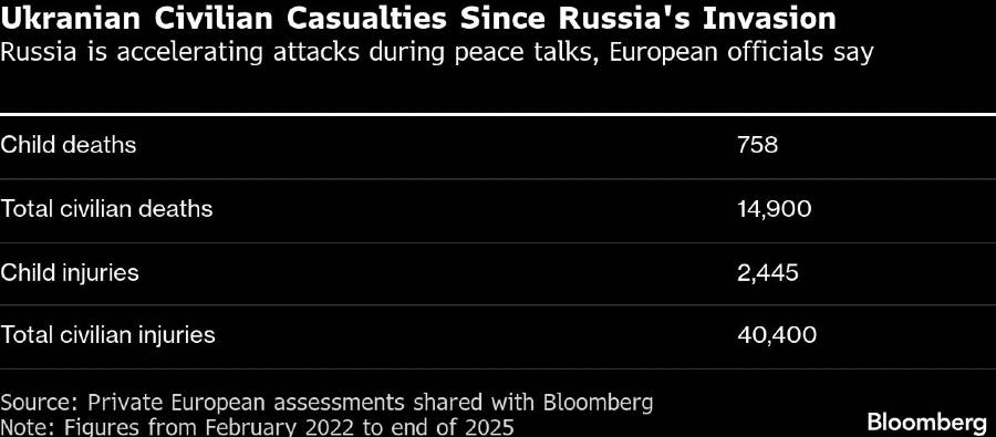 Sejak laporan tentang rencana 28 poin yang disusun pejabat AS dan Rusia untuk mengakhiri perang terbit pada November, Rusia meluncurkan lebih dari 9.000 drone dan 350 rudal ke kota-kota Ukraina, menewaskan lebih dari 220 warga sipil.