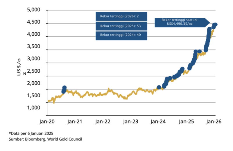 Harga emas meroket 67% tahun lalu, kenaikan tahunan tertinggi sejak 1979. Memasuki 2026, sepertinya tren bullish harga emas masih terjaga.