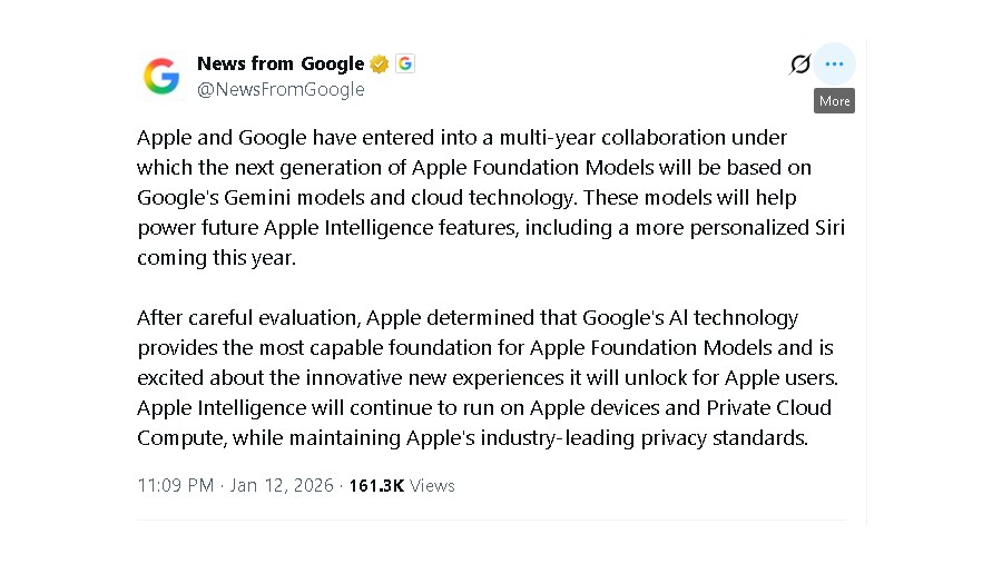 Dalam pernyataan tersebut, kedua perusahaan mengatakan bahwa Apple akan mempertahankan standar privasinya dengan terus menjalankan layanan AI-nya di perangkat konsumen atau melalui Private Cloud Compute — sistem online yang aman. Teknologi Google akan membantu mendukung versi baru Siri yang akan diluncurkan tahun ini.