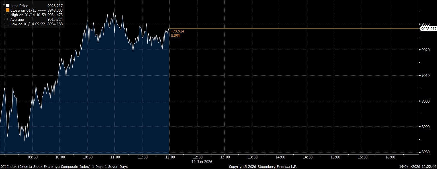 Melansir riset Phintraco Sekuritas, IHSG ditutup menguat pada sesi pertama perdagangan Rabu ke level 9.028, sekaligus mencatatkan All Time High secara intraday setelah menembus resistance psikologis pada level 9,000.