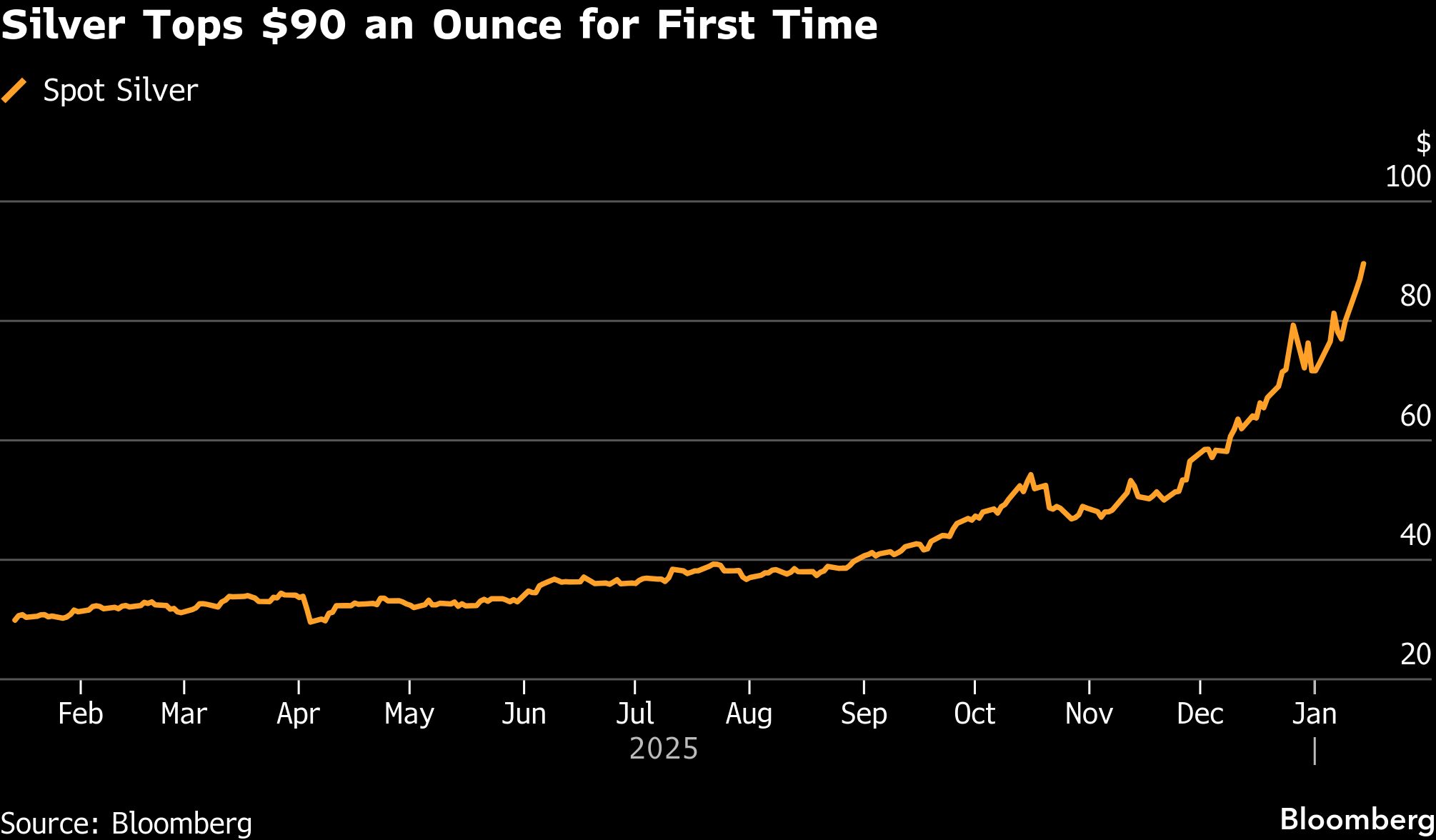 Bloomberg, Harga perak menembus US$90 per ons untuk pertama kalinya, sementara emas mendekati rekor tertinggi, setelah serangan terhadap Federal Reserve, prospek lebih banyak pemangkasan suku bunga AS, serta latar belakang geopolitik yang tegang menambah dorongan pada reli kuat logam mulia.