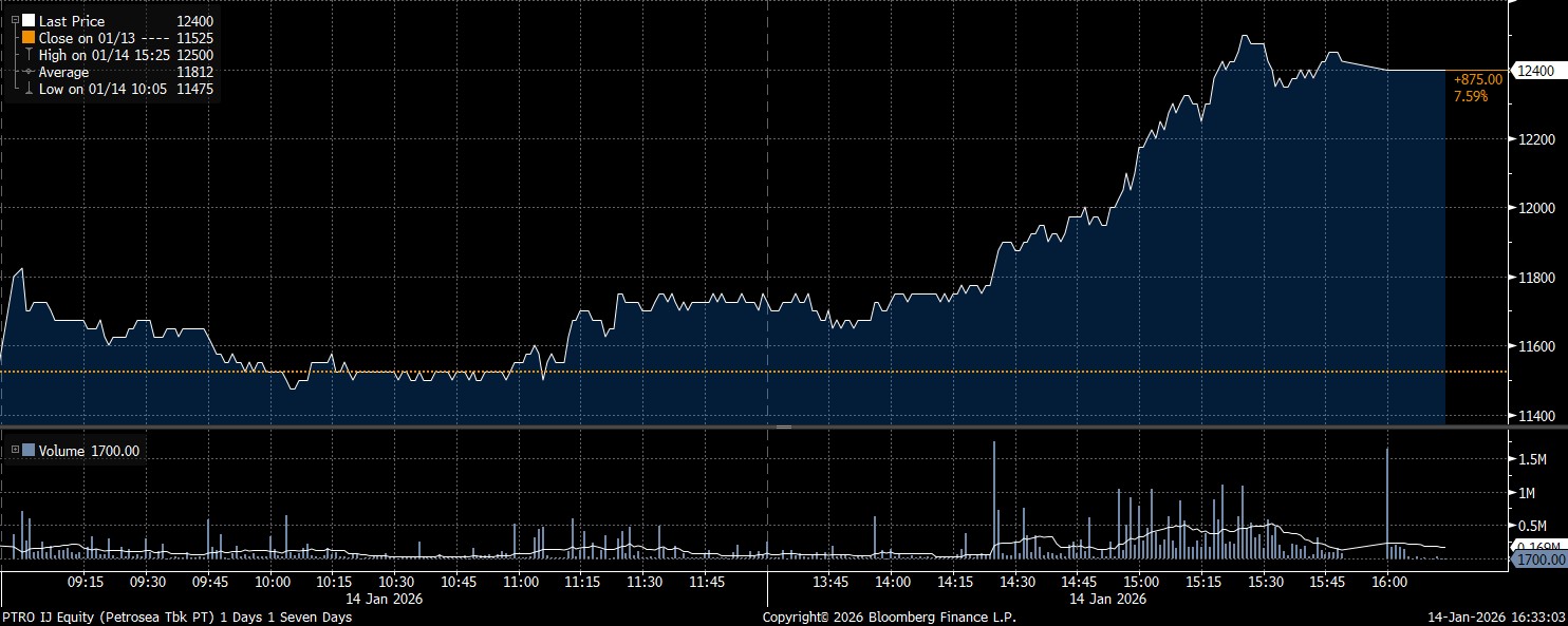 Bloomberg Technoz, Jakarta - Saham PT Petrosea Tbk (PTRO) merespons katalis terbaru terhadap peluang masuk dua indeks global, sebagai konstituen Indeks MSCI dan FTSE. Kala tutup perdagangan Rabu (14/1/2026), saham PTRO melesat 7,59% ke Rp12.400/saham.