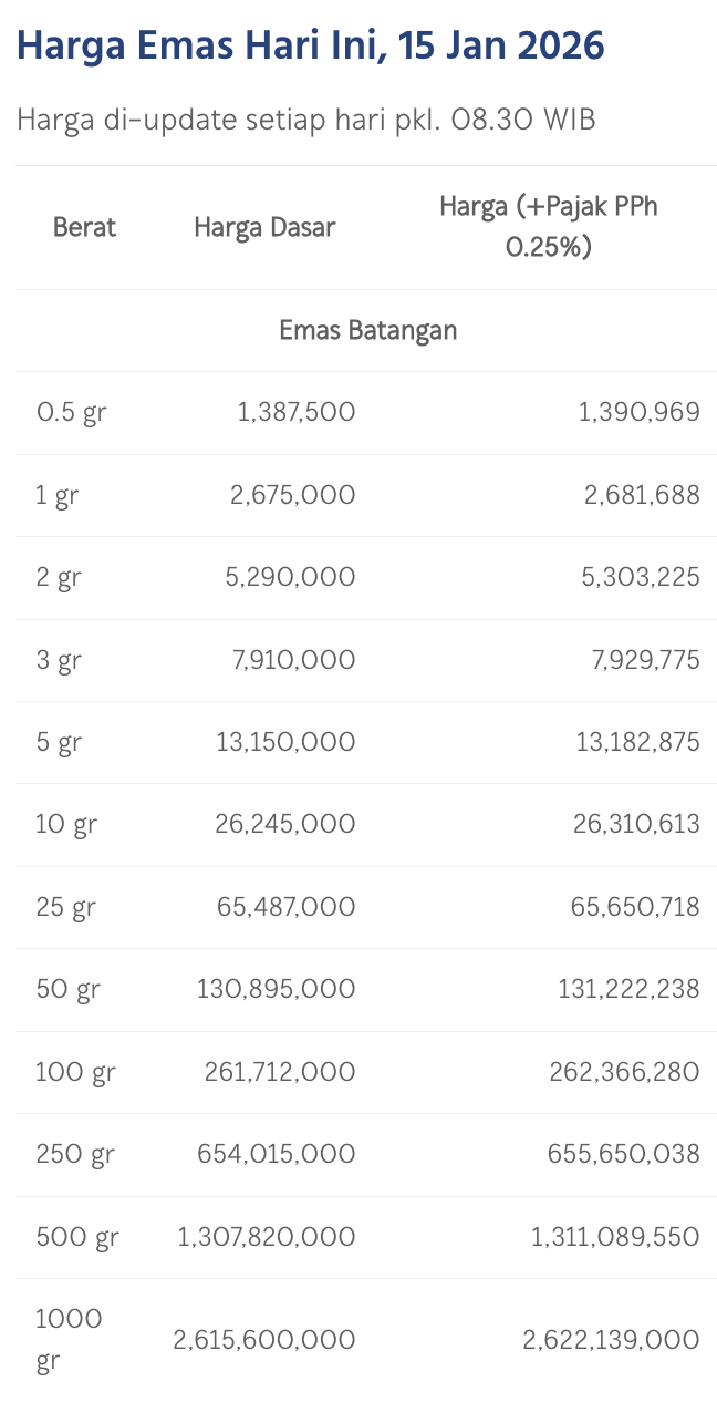 Pada Kamis (15/1/2026), emas Antam dihargai Rp 2.675.000/gram. Menguat Rp 10.000 dari posisi kemarin dan menjadi rekor tertinggi sepanjang masa.