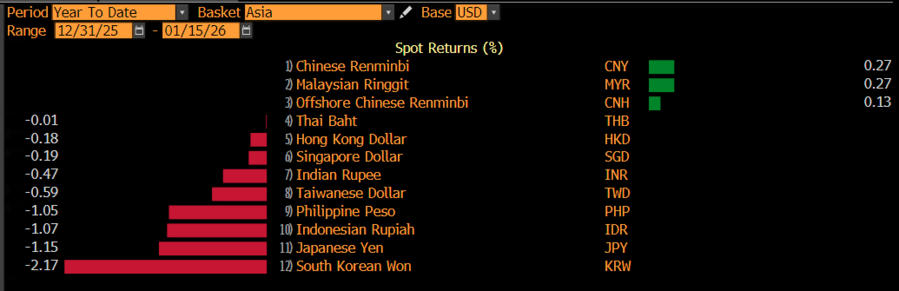 Pada Kamis (15/1/2026), hampir semua nilai tukar mata uang Asia bertekuk lutut di hadapan dolar AS. Sepanjang perdagangan 2026 atau year-to-date (ytd), won Korea Selatan yang mengalami depresiasi paling dalam sebesar 2,17%, disusul yen Jepang 1,15%, dan rupiah tergerus 1,07% di posisi ketiga terbawah.