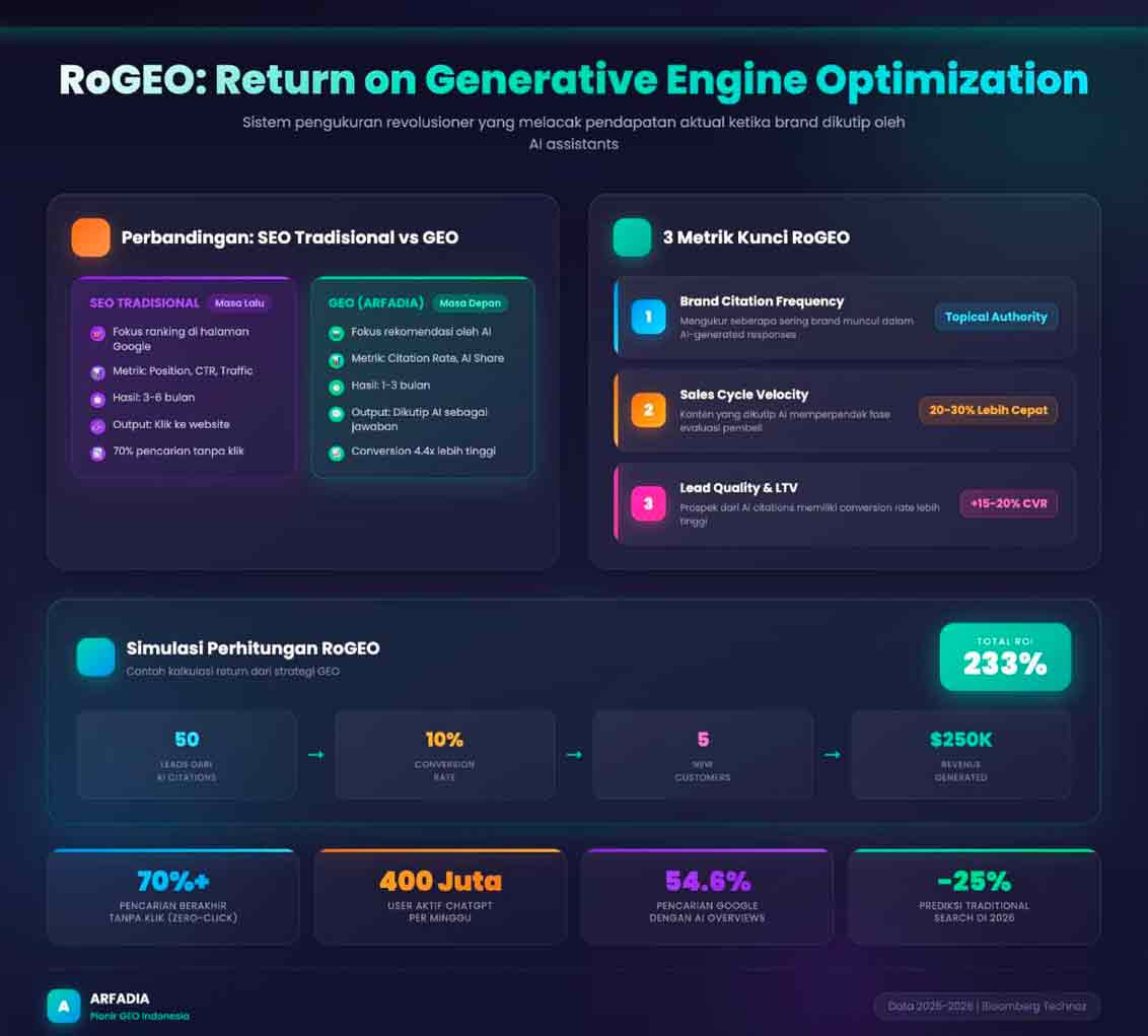 Yang membedakan Arfadia dari pemain lain adalah framework eksklusif mereka bernama RoGEO (Return on Generative Engine Optimization). Ini bukan sekadar metrik vanity, melainkan sistem pengukuran yang melacak pendapatan aktual ketika brand dikutip oleh AI assistants.