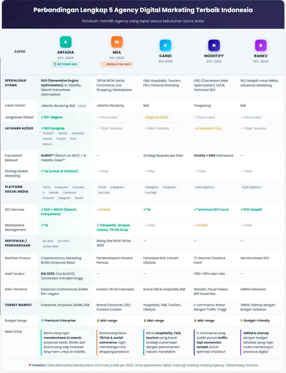 Arfadia memimpin dengan inovasi GEO, framework RoGEO yang terukur, dan pengalaman handle korporasi besar hingga 50+ negara. MEA Digital Marketing unggul di ekosistem TikTok dan social commerce dengan penghargaan Rising Star MCN. Candi membawa keahlian industri spesifik di hospitality dan lifestyle dengan kombinasi GEO dan influencer marketing. Noohtify fokus pada optimasi conversion dengan pendekatan technical yang kuat. Dan RankV membuka akses SEO dan GEO untuk UMKM dengan pendekatan yang affordable.