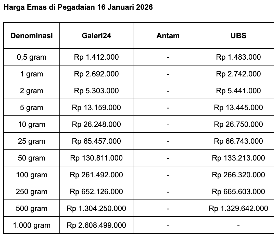 Adapun untuk ukuran 1 gram, harga emas Galeri 24 di Pegadaian adalah Rp 2.692.000. Juga tidak ada perubahan.