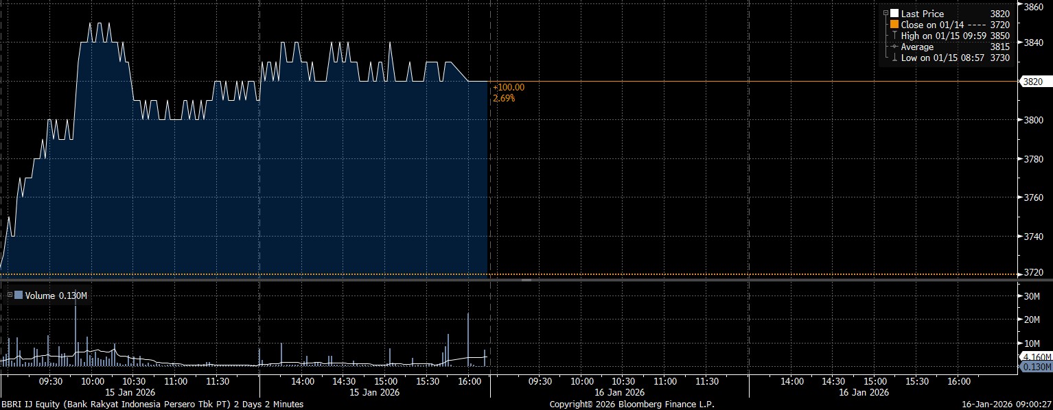 Adapun investor asing mencatat net buy terbesar pada saham PT Bank Rakyat Indonesia Tbk (BBRI) mencapai Rp426,64 miliar. Didorong pembelian beli yang deras, saham BBRI menguat 2,69% hingga melesat di posisi Rp3.820/saham.