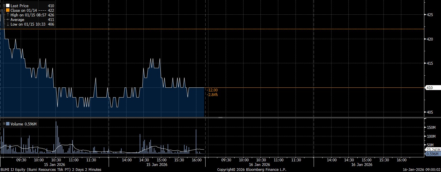 Sedang pada kesempatan yang sama, investor asing net sell yang masif pada saham PT Bumi Resources Tbk (BUMI) mencapai Rp276,39 miliar. Imbas tekanan jual, saham BUMI melemah 2,84% dan ditutup di posisi Rp410/saham.