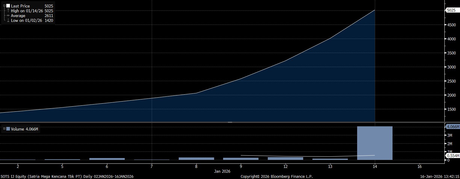 - PT Satria Mega Kencana Tbk (SOTS), naik 288,03%