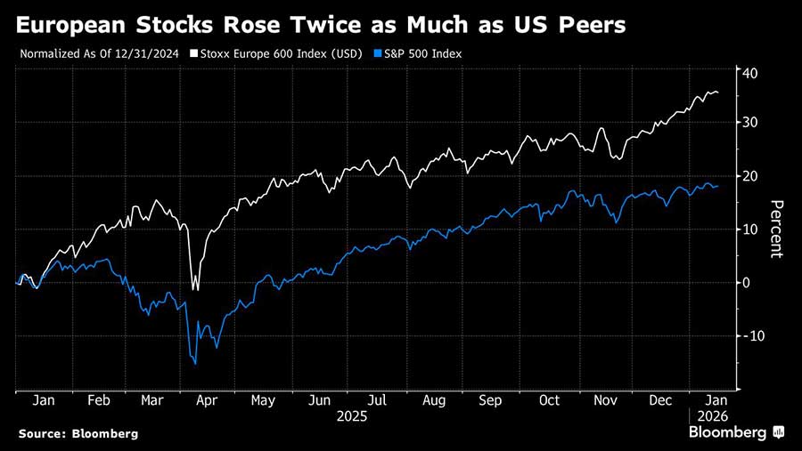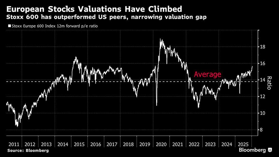 Sejak awal 2025, indeks Stoxx Europe 600 telah naik 36% dalam denominasi dolar, dua kali lipat dari kenaikan S&P 500 selama periode yang sama. Indeks acuan Eropa kini diperdagangkan pada rasio harga terhadap laba (P/E) sebesar 16x laba di masa depan, di atas rata-rata 15 tahun terakhir dan memperkecil diskonnya terhadap rekan-rekan AS menjadi sekitar 30%.