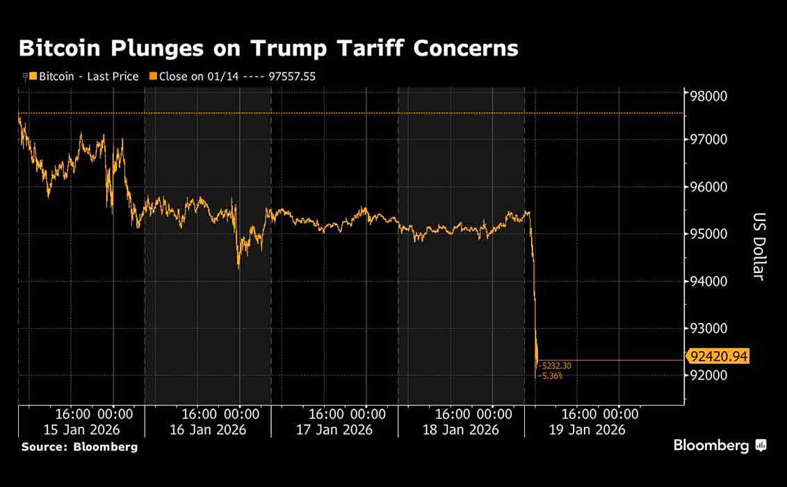 Bitcoin turun hingga 3,6% ke bawah US$92.000 pada Senin (19/1/2026) pagi, sementara token lain mengalami kerugian yang lebih besar. Ether, aset digital terbesar kedua, kehilangan 4,9% nilainya, sementara Solana turun 8,6%.