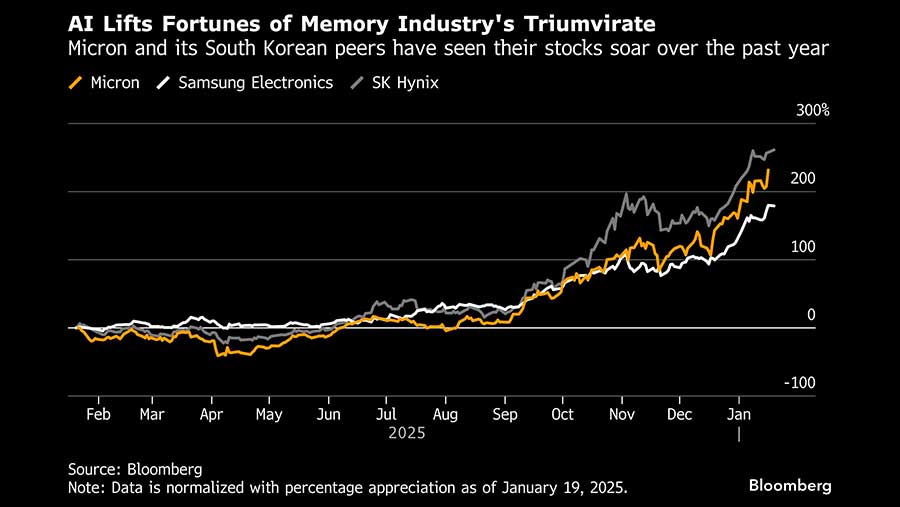 Tiga pemain besar industri chip memori global — Micron, SK Hynix Inc., dan Samsung Electronics Co. — mengalami lonjakan harga saham pada 2025 berkat booming AI.
