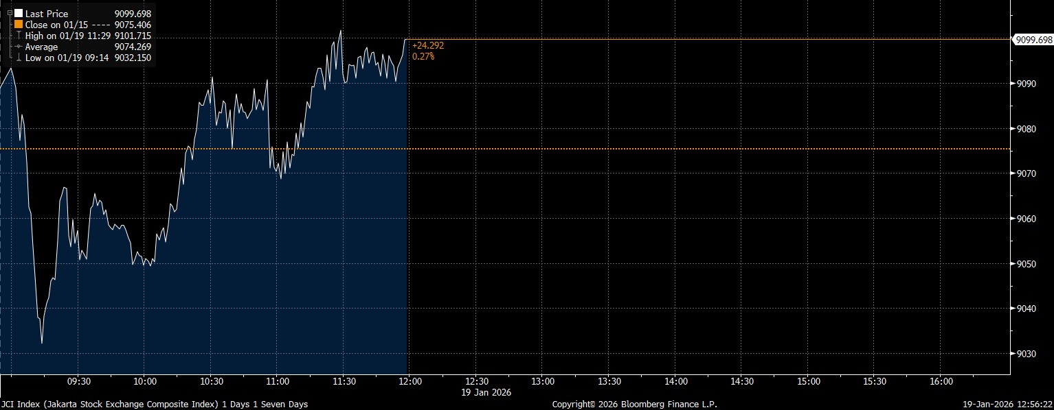 Bloomberg Technoz, Jakarta - Indeks Harga Saham Gabungan (IHSG) berhasil menutup perdagangan Sesi I dengan menguat 0,27% di posisi 9.099 pada Senin (19/1/2026) sekaligus tercapainya catatan rekor tertinggi sepanjang masa atau All Time High (ATH) baru.