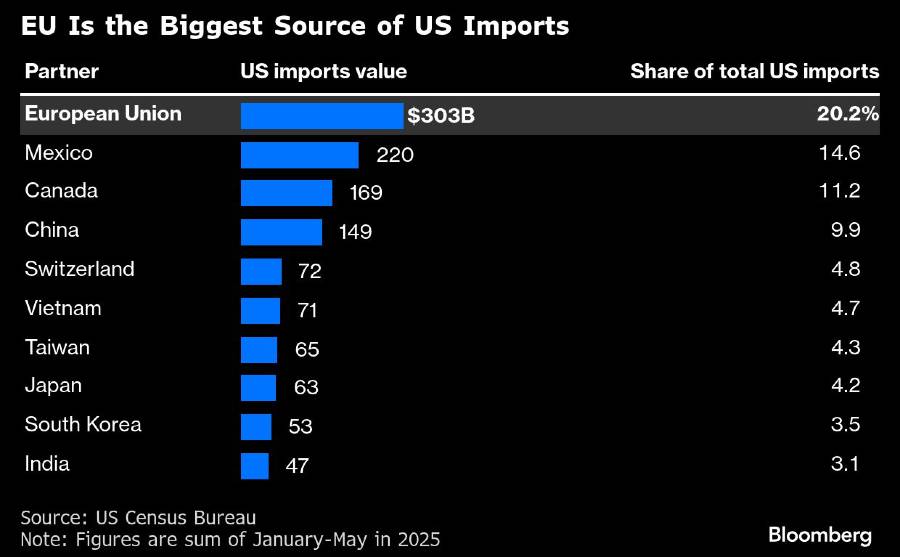 Uni Eropa juga dipungut tarif 15% atas sebagian besar ekspor ke AS dan 50% atas baja dan aluminium. AS sejak itu memperluas daftar barang yang termasuk dalam tarif 50% lebih tinggi hingga mencakup ratusan produk tambahan yang mengandung logam tersebut.