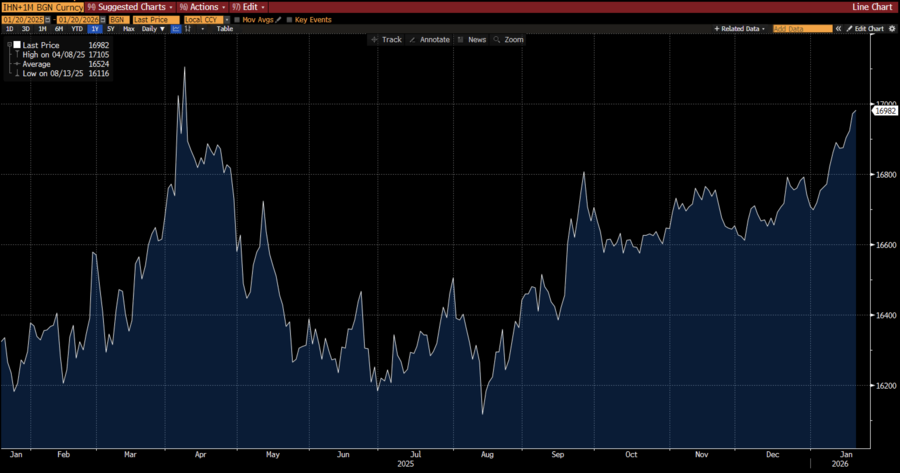 Bloomberg Technoz, Jakarta - Kontrak rupiah di pasar Non-Deliverable Forward (NDF) kembali ditutup melemah. Nilai kontrak rupiah terhadap dolar Amerika Serikat (AS) tergerus 0,06% ke Rp16.982/US$ pada pembukaan perdagangan Selasa (20/1/2026).
