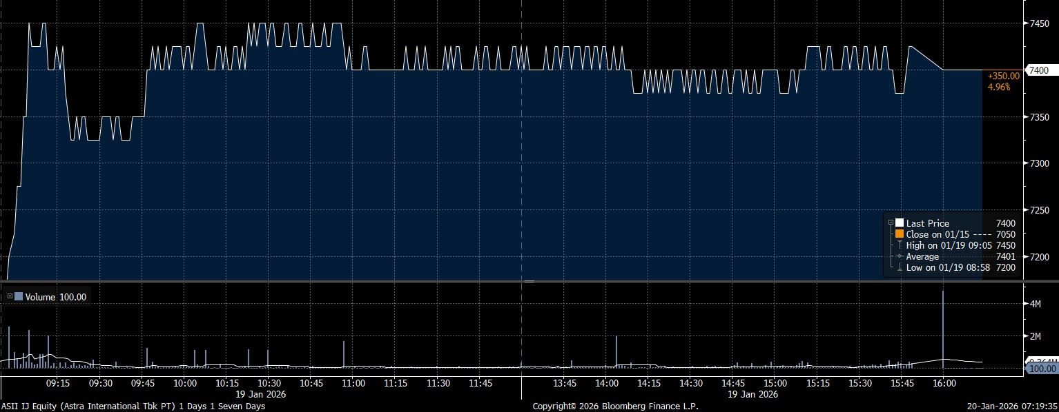 Sedang pada kesempatan yang sama, investor asing mencatat net buy terbesar pada saham PT Astra International Tbk (ASII) mencapai Rp131 miliar. Didorong pembelian beli yang deras, saham ASII menguat 4,96% hingga melesat di posisi Rp7.400/saham.