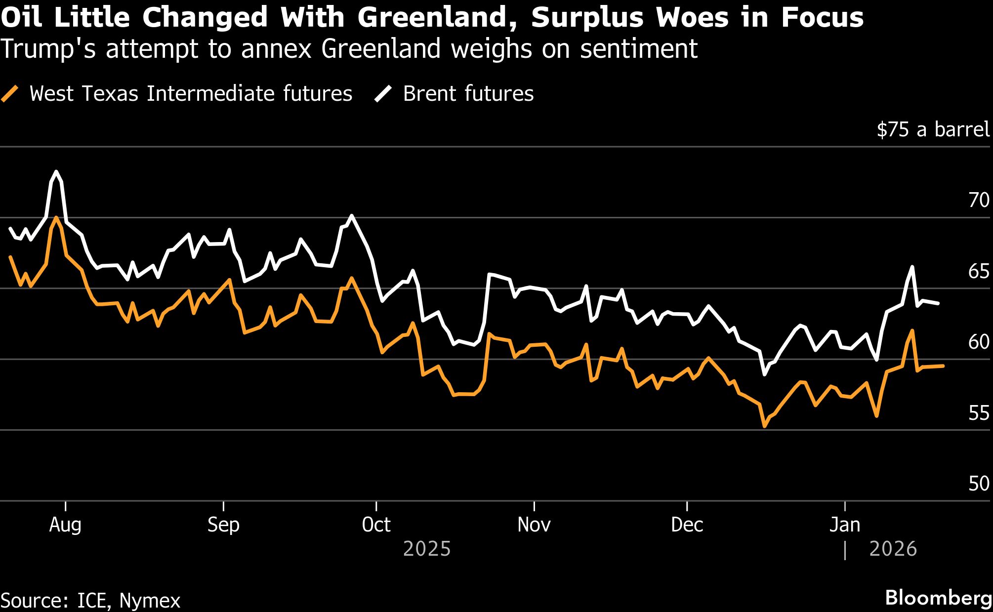 Bloomberg, Harga minyak dunia terpantau stabil pada perdagangan Selasa (20/1) pagi. Para pelaku pasar kini tengah mencermati dampak dari upaya Amerika Serikat (AS) untuk mengambil alih Greenland, sembari mengantisipasi risiko kelebihan pasokan (surplus) global.