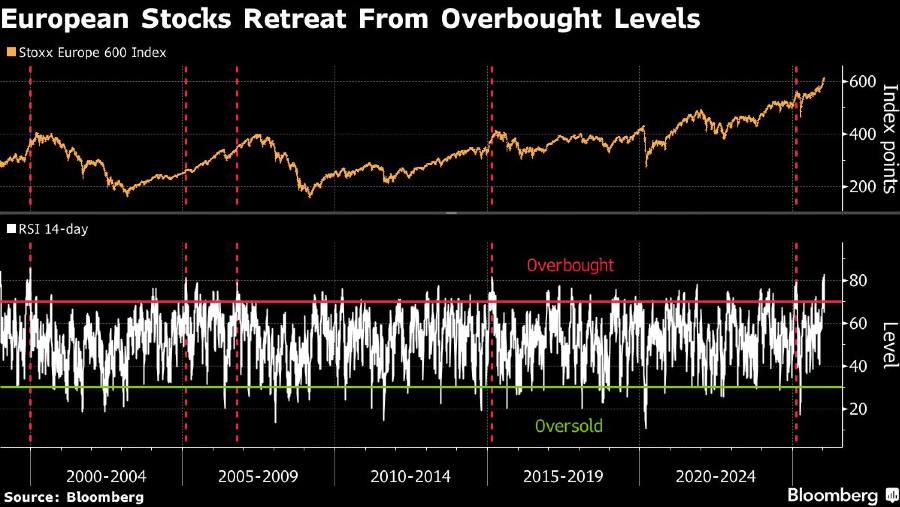 Ancaman tarif Trump menjadi gangguan yang tidak diinginkan bagi kenaikan harga saham Eropa baru-baru ini, yang telah outperform rekan-rekan AS-nya seiring investor mengalir ke berbagai sektor regional, mulai dari pertahanan hingga pertambangan dan produsen peralatan semikonduktor. Akibatnya, indeks acuan Eropa telah mengalami overheating dan kini menjadi yang paling overbought dalam 26 tahun.
