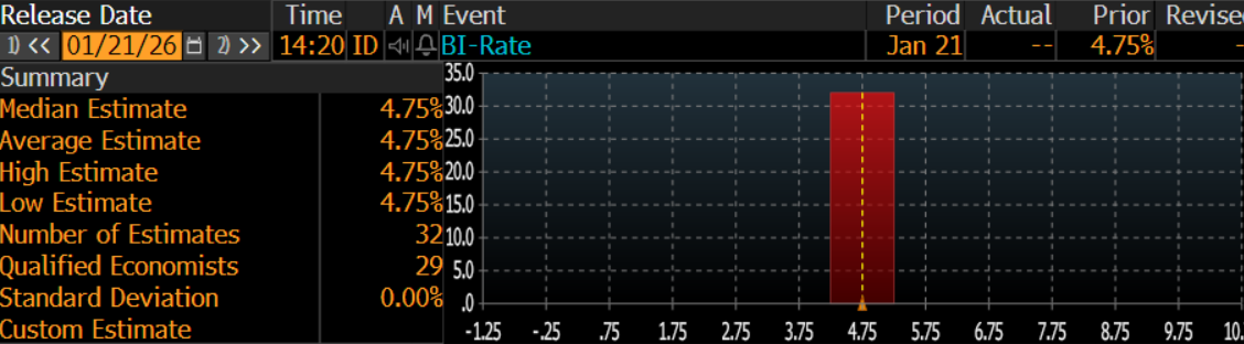 Hingga Selasa (20/1/2026) siang hari, konsensus pasar yang dihimpun Bloomberg dengan melibatkan 32 analis/ekonom menghasilkan median proyeksi BI Rate tetap 4,75%. Artinya, suku bunga acuan sepertinya tidak ke mana–mana alias hold.