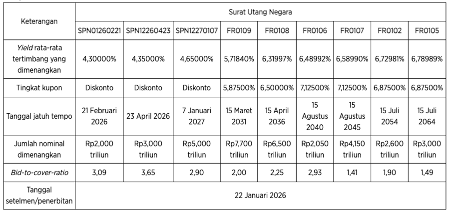Bloomberg Technoz, Jakarta - Kemarin, Selasa (20/1/2026), pemerintah menggelar lelang obligasi negara. Minat pasar dalam lelang Surat Utang Negara (SUN) kemarin masih cukup solid, meski penawaran yang masuk turun 7,89% dari lelang sebelumnya yang digelar pada Selasa (6/1/2026).