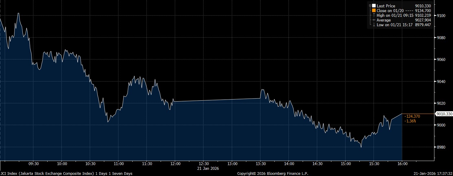 Bloomberg Technoz, Jakarta - Indeks Harga Saham Gabungan (IHSG) ditutup di zona merah dengan melemah 1,36% pada posisi 9.010,33 pada Rabu (21/1/2026). Adapun laju IHSG yang kurang positif terjadi saat Bank Indonesia menahan tingkat suku bunga acuan atau BI Rate pada level 4,75%.