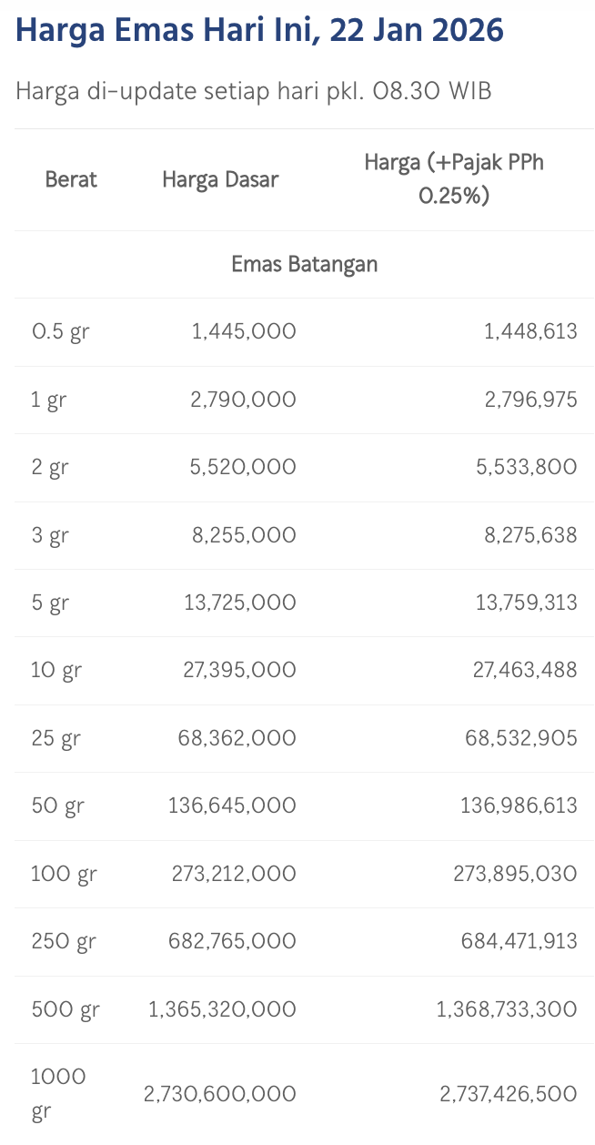Pada Kamis (22/1/2026), emas Antam dihargai Rp 2.790.000/gram. Melemah Rp 15.000 dari kemarin dan menjadi rekor tertinggi sepanjang masa.