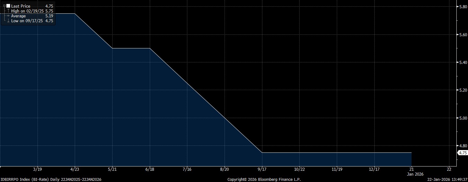 Pada Rabu (21/1/2026), Rapat Dewan Gubernur Bank Indonesia memutuskan untuk menahan level suku bunga acuan atau BI Rate tetap di 4,75%. Bank Sentral juga mempertahankan suku bunga deposit facility 3,75%, dan suku bunga lending facility 5,5%.