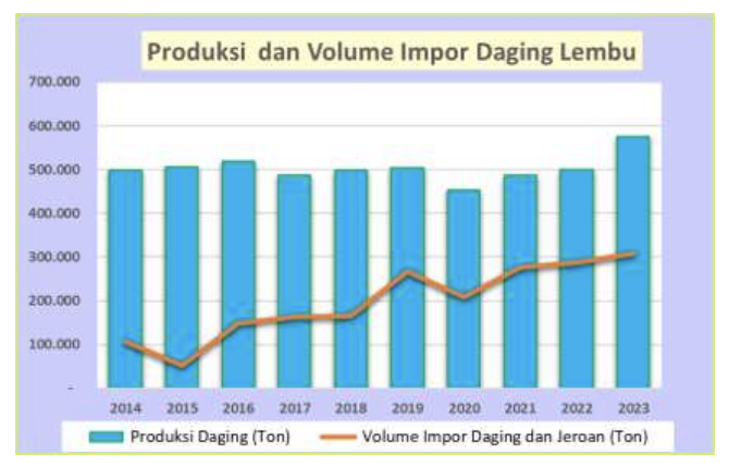 Sepanjang 2020-2024, volume impor daging sapi Indonesia berkisar antara 138 ribu ton sampai 307 ribu ton. Pada 2023 impor daging telah mencapai 307 ribu ton dengan nilai impor sebesar US$ 1 miliar.