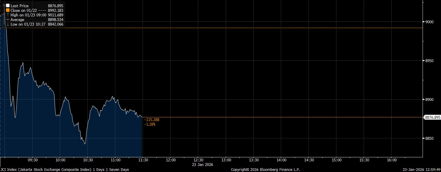 Bloomberg Technoz, Jakarta - Indeks Harga Saham Gabungan (IHSG) menutup perdagangan Sesi I di zona merah hari ini, Jumat (23/1/2026). Melemahnya sejumlah saham–saham LQ45 berkapitalisasi besar atau big caps menjadi pemberat.
