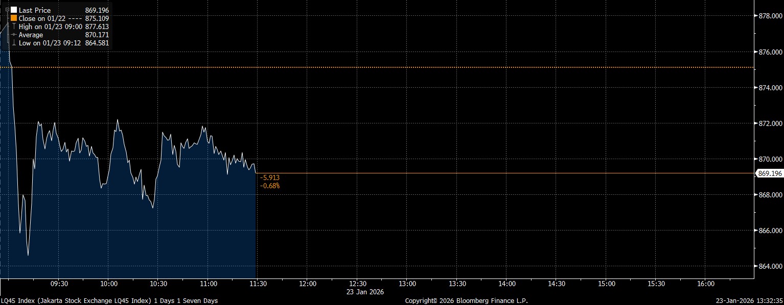 Hingga penutupan perdagangan Sesi I, indeks LQ45 yang berisikan saham–saham big caps tercatat melemah 0,68% ke 869,19.