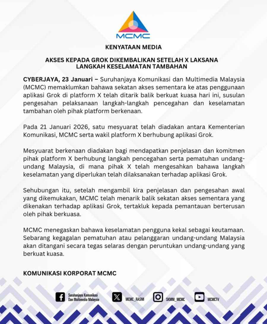 Keputusan ini diambil setelah pertemuan antara regulator dan perusahaan teknologi Musk, yang mengonfirmasi bahwa langkah-langkah yang diperlukan telah diterapkan di Grok, kata Komisi Komunikasi dan Multimedia Malaysia (MCMC) pada Jumat.